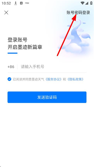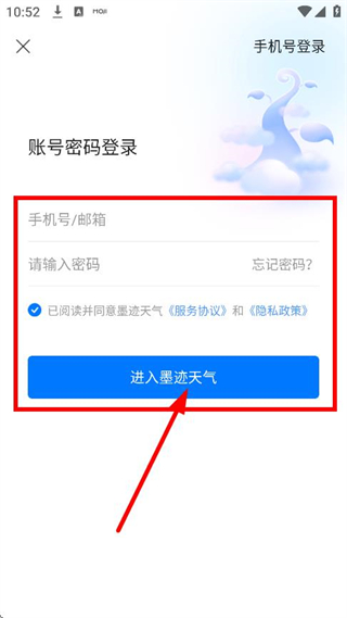 4、在输入手机号/邮箱、密码后点击进入墨迹天气,完成账号登录操作。