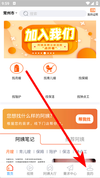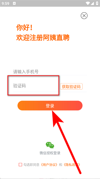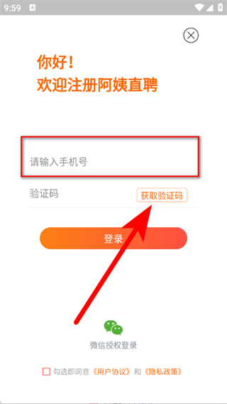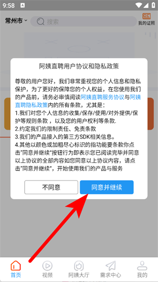 1、打开阿姨直聘平台,在弹窗中,点击同意并继续。