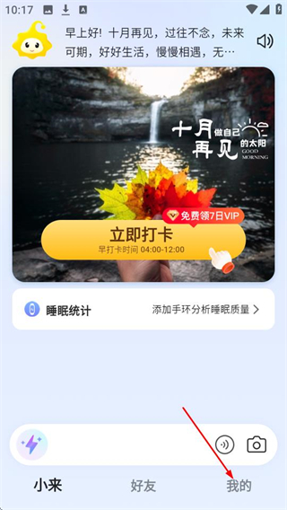 1、打开小来早晚安,点击页面右下角我的,可进入个人中心页面。
