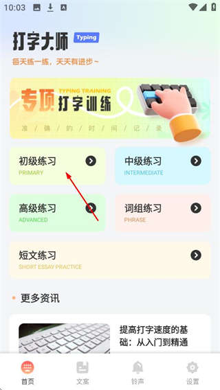 1、打开打字通,点击初级练习,可进入初级练习内容列表页面。