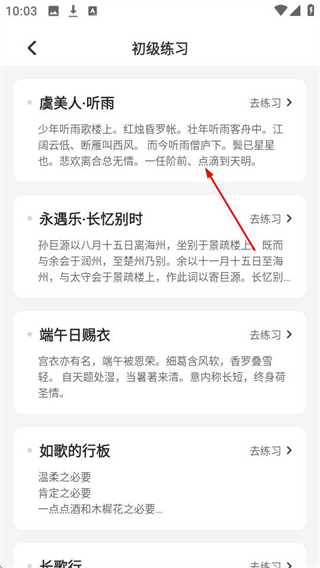 2、在初级练习内容列表页面,点击虞美人听雨可进入该练习页面。