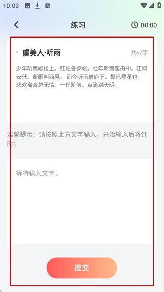 3、在练习页面,按照上方文字输入内容后点击提交可完成练习提交。
