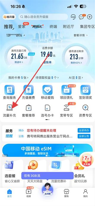 1、打开中国移动广西APP,点击流量补充,进入流量专区。