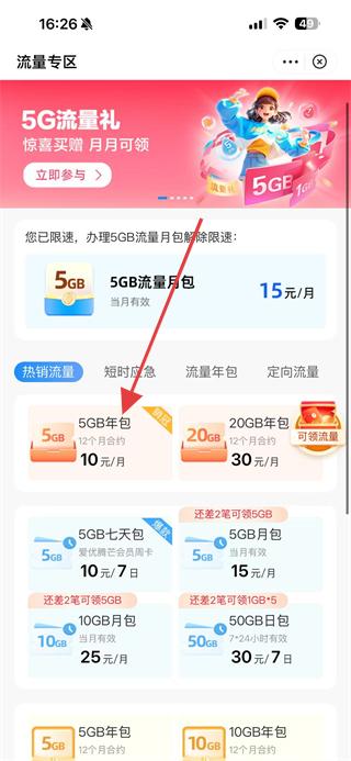 2、在流量专区选择流量套餐如5GB年包10元/月,进入套餐详情页。