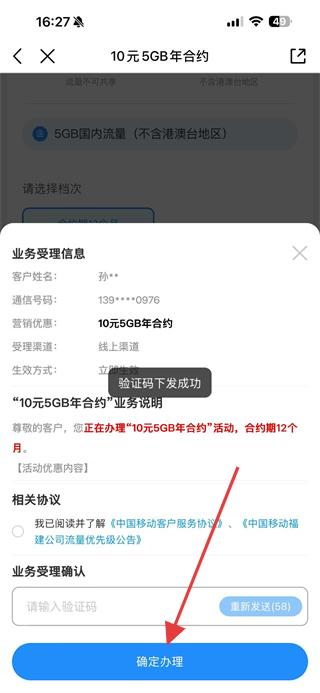 4、在业务受理信息框输入验证码后点击确定办理,完成流量充值。