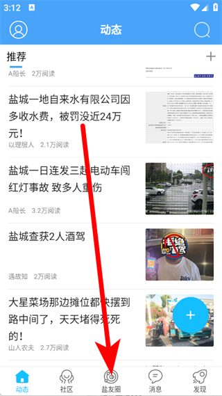 1、打开盐城123网,点击底部盐友圈,进入盐友圈页面。