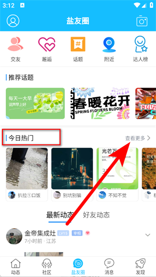 2、在盐友圈页面,找到今日热门板块,点击查看更多。