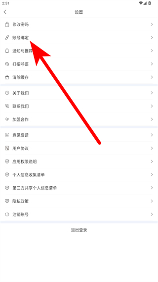 3、在设置界面中,点击账号绑定选项,进入账号绑定页面。
