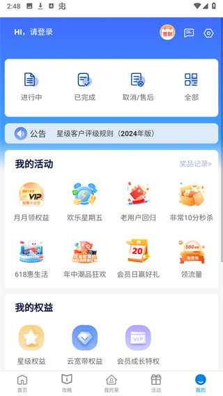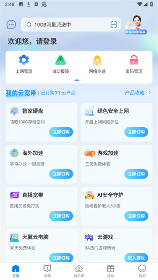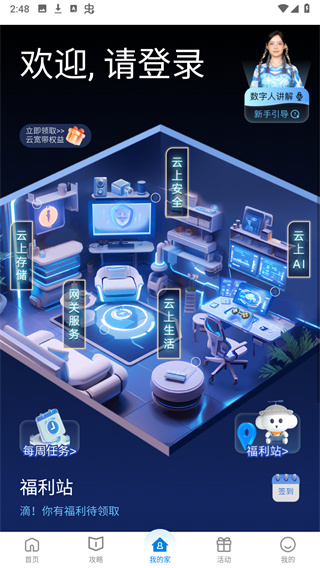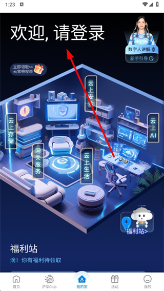 1、打开电信云宽带APP,在我的家页面点击请登录区域。