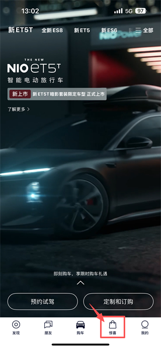 1、打开蔚来APP,点击底部惊喜选项,进入NIO-Life板块页面。