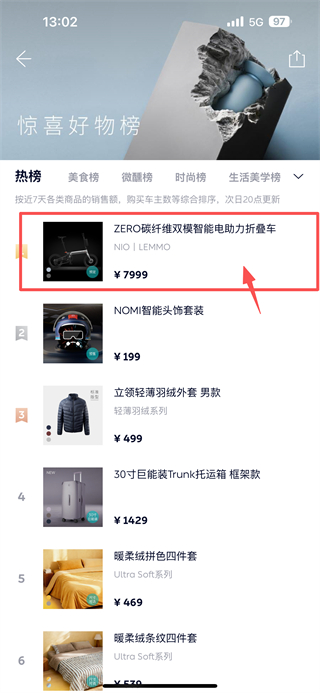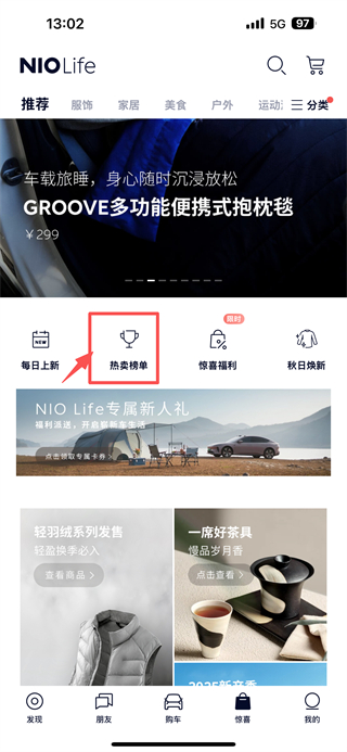 2、在NIO-Life页面,点击热卖榜单选项,查看热卖商品列表。