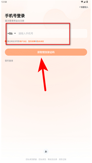 2、进入手机号登录界面,输入手机号并点击获取短信验证码。