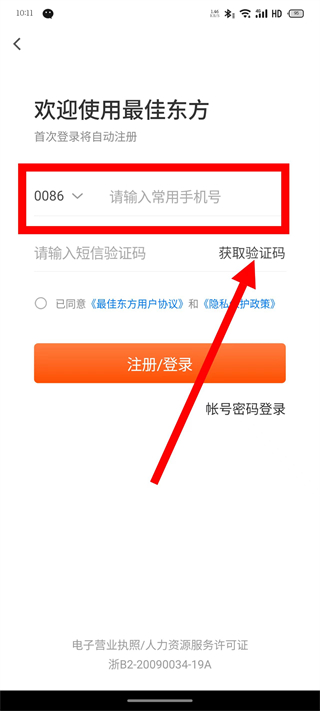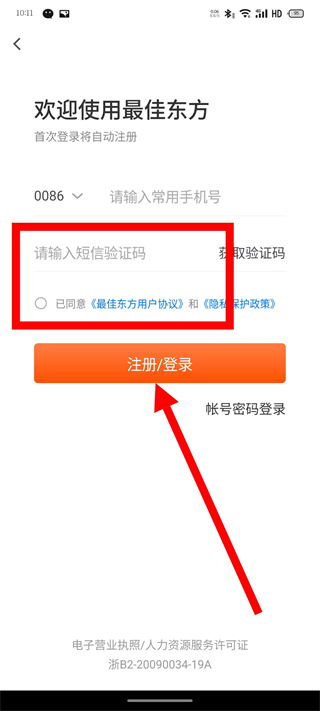 4、输入收到的短信验证码,勾选同意后,点击注册登录按钮,完成账号注册。