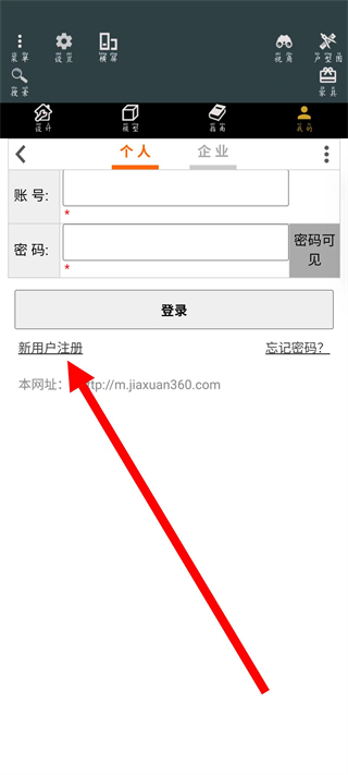 2、在个人页面,点击新用户注册,进入用户注册页面。
