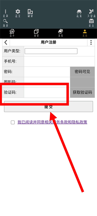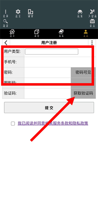3、选择用户类型,输入手机号码、密码、图形码,点击获取验证码。