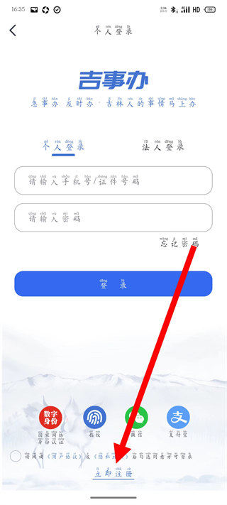 2、在个人登录页面,点击立即注册,进入注册页面。