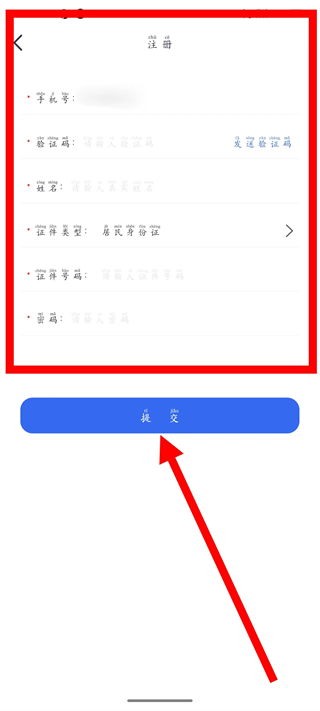 4、完善账号、密码、证件类型及号码等信息后,点击提交,完成账号注册。
