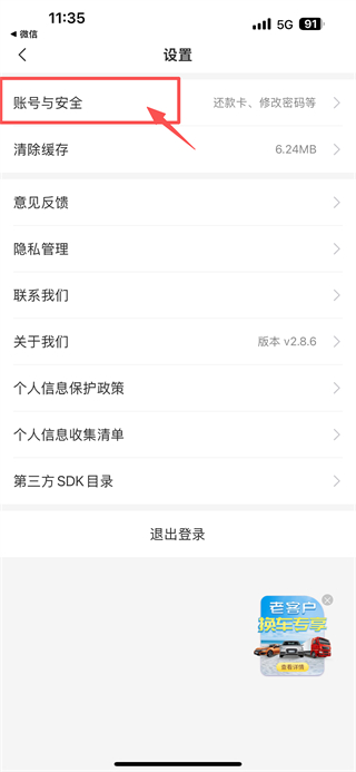 3、在设置页面,点击账号与安全选项,进入账号与安全页面。