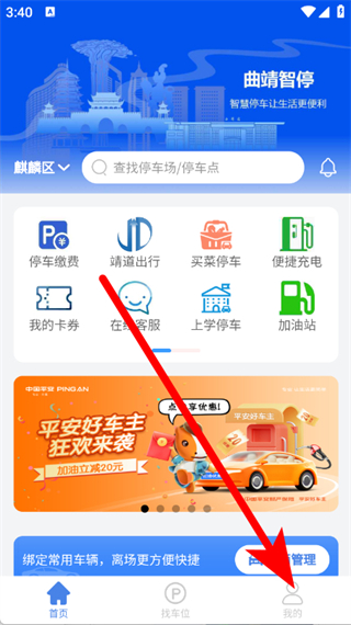 1、打开曲靖智停,点击底部导航栏我的,进入个人页面。