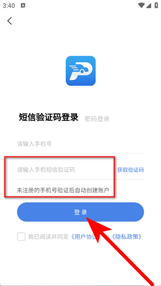 4、输入收到的短信验证码,勾选同意后,点击登录按钮,完成账号登录操作。