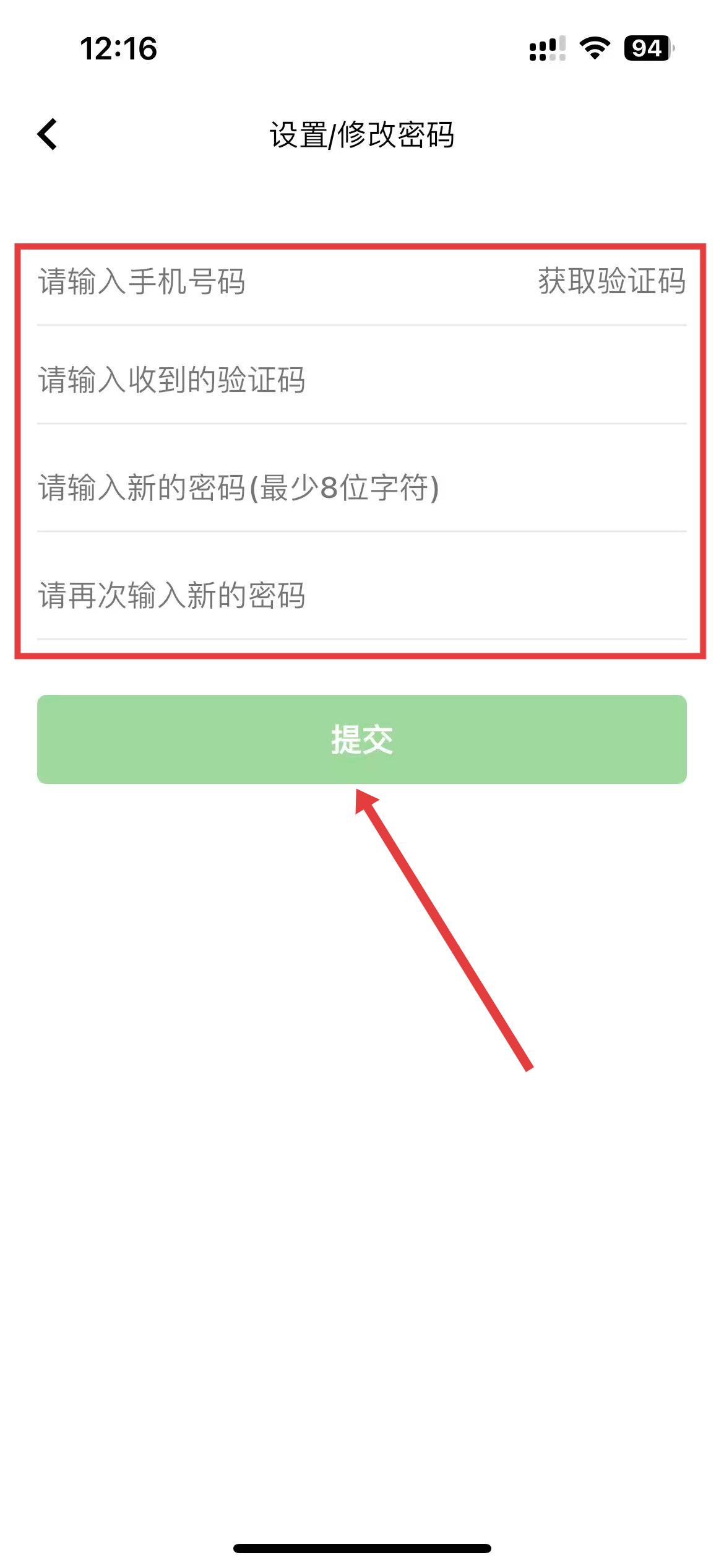 5、按提示输入手机号码并获取验证码,再设置新密码,点击提交即可完成密码修改。