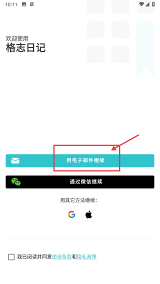 3、在登录注册方式选择页面,点击用电子邮件继续选项,进入电子邮件注册信息填写页面。