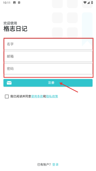 4、在电子邮件注册页面,填写名字、邮箱及密码,勾选同意协议后点击注册按钮,完成账号注册操作。