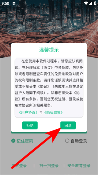 1、打开易查车,在温馨提示弹窗中点击同意。