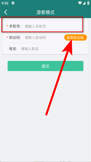 3、在游客登录页面,输入手机号码,点击获取验证码。