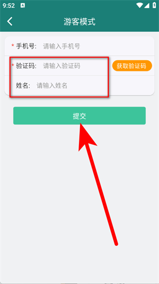 4、输入收到的短信验证码,输入姓名后,点击提交按钮,完成游客登录。