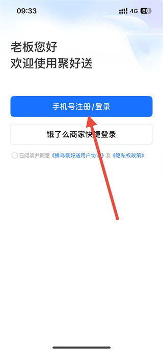 1、打开蜂鸟聚好送APP,点击手机号注册登录按钮。