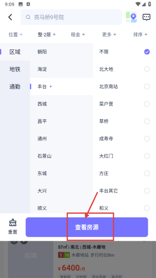 3、在位置页面当中选择丰台不限,点击查看房源。