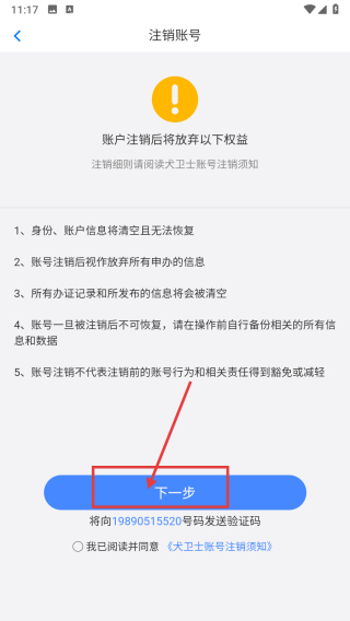 4、在注销须知页面,仔细阅读账号注销后放弃的权益及风险提示,点击下一步按钮,完成账号注销操作。