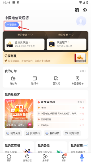 2、在个人中心,点击一键登录选项,进入登录方式选择页面。