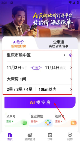 流程简化为两步,确定入住需求与筛选条件后,选择AI砍价或自主出价模式提交即可,无需复杂操作,新手也能快速上手完成预订。