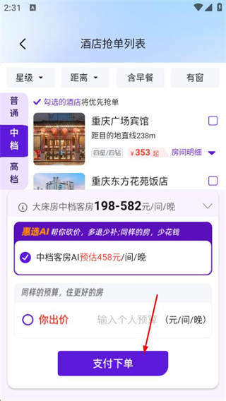 2、在酒店抢单列表页面,选择心仪酒店后点击支付下单,进入订单支付页面。