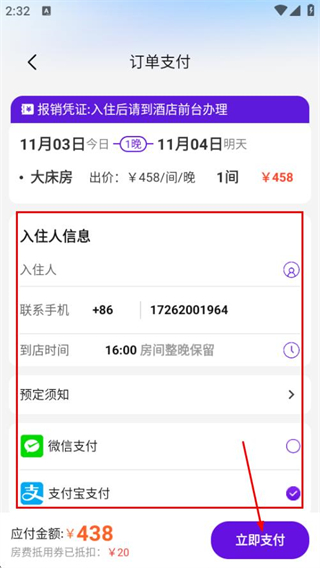 3、填写信息,选择支付方式后点击立即支付,完成酒店预订支付。