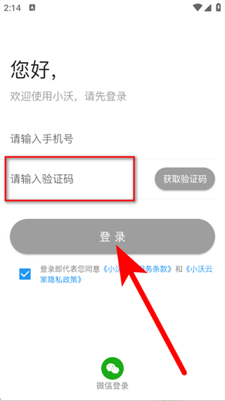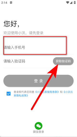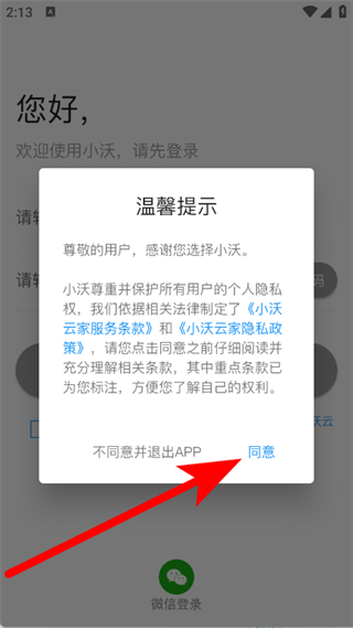 1、打开小沃云家,在弹窗中点击同意,进入登录页面。
