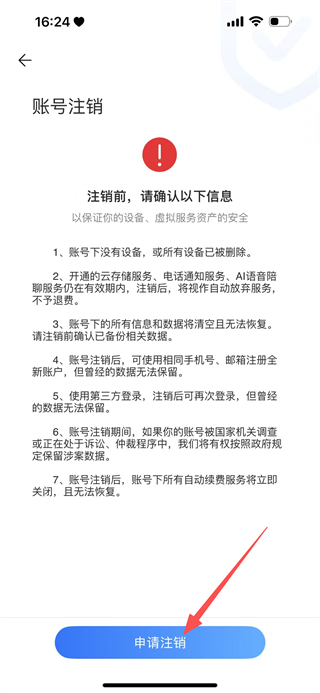 5、在账号注销说明页面,点击申请注销,进入验证码输入页面。