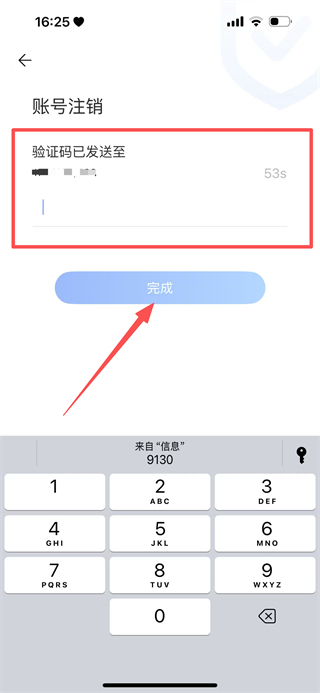 6、在验证码输入页面,输入收到的验证码后,点击完成,完成账号注销操作。