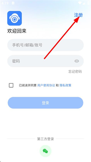2、在登录页面,点击右上角注册,进入注册方式选择页面。