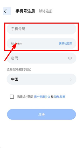 3、在手机号注册页面,输入手机号码,点击获取验证码并输入。