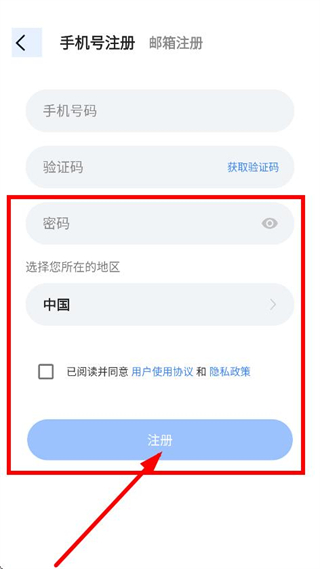 4、在手机号注册页面,设置密码,点击注册,完成账号注册操作。
