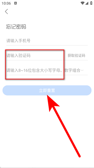 4、输入验证码,设置新密码,点击立即重置,完成密码重置。