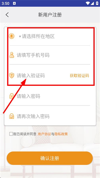 3、在新用户注册页面,选择所在地区,填写手机号码,获取验证码并输入。