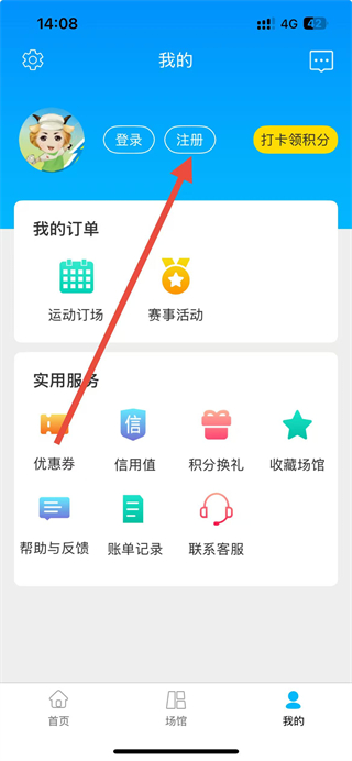 2、在个人页面上方,点击注册选项,进入注册页面。