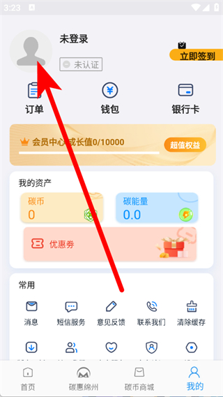2、在个人页面,点击未登录的头像,进入登录页面。