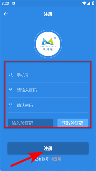 4、进入注册页面,输入手机号点击获取验证码并输入收到的验证码等信息,点击注册按钮,完成账注册流程。