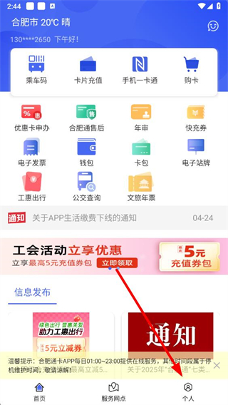 1、打开合肥通卡APP,点击右下角个人进入个人页面。