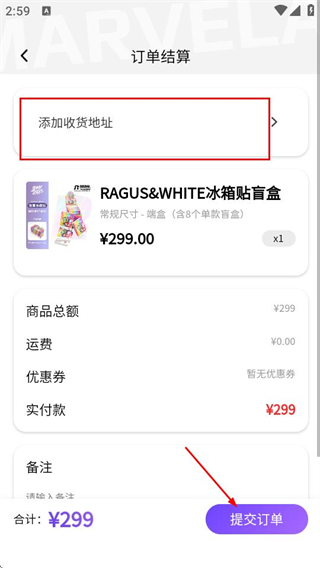 5、在订单结算页面,添加收货地址后点击提交订单,可完成商品购买流程。
